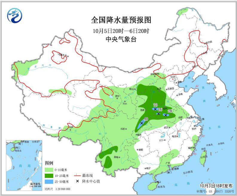 10月5日20時(shí)至6日20時(shí),西藏東部、西北地區(qū)中東部、華北中西部、黃淮西部、江漢西部、西南地區(qū)大部、華南中南部、臺(tái)灣島等地的部分地區(qū)有小到中雨,陜西南部、河南南部和西部、四川盆地東北部等地局地有大雨(25~40毫米)。江西北部部分地區(qū)有5~6級(jí)風(fēng)(見(jiàn)圖5)。
