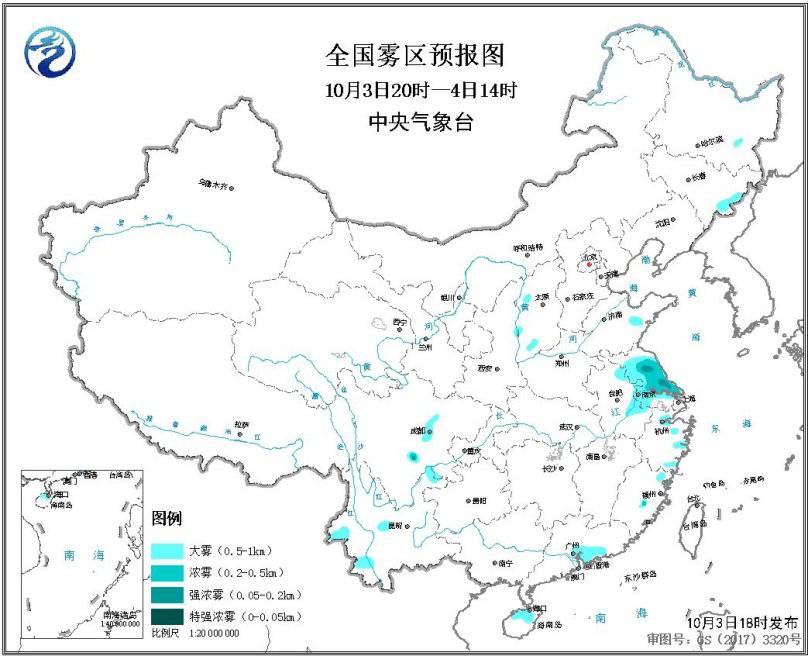 受冷空氣和降水共同影響,全國(guó)大部地區(qū)大氣擴(kuò)散和清除條件較好。僅在4日至5日,新疆南疆盆地、甘肅西部以及內(nèi)蒙古西部等地的部分地區(qū)有揚(yáng)沙或浮塵天氣。此外,3日夜間至4日早晨,江蘇大部、浙江東部、安徽東部等地的部分地區(qū)有大霧,局地能見(jiàn)度不足200米,中央氣象臺(tái)于10月3日18時(shí)發(fā)布大霧預(yù)報(bào)(見(jiàn)圖2)。