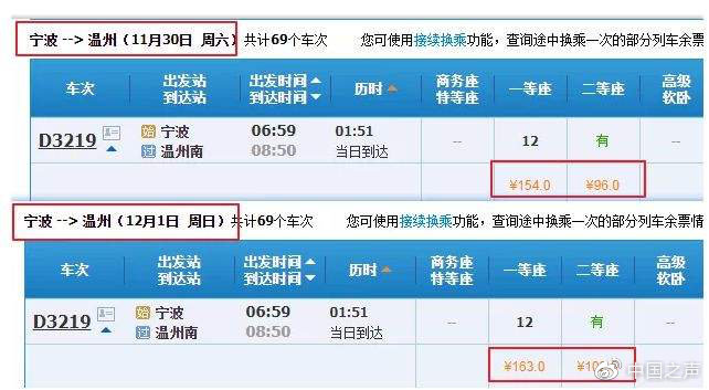 按照5.5折最低折扣,目前蘭州到西安的票價(jià)為174.5元,在最低價(jià)時(shí),或?qū)⒅恍?6元。然而,票價(jià)也并不是都處于降價(jià)趨勢(shì),對(duì)于部分列車(chē)段而言,票價(jià)也出現(xiàn)了上升的情況。以寧波開(kāi)往溫州的G2343次列車(chē)為例,11月30日,該車(chē)的商務(wù)座288元,一等座154元,二等座96元;而12月1日,該車(chē)的票價(jià)商務(wù)座、一等座、二等座分別上漲17元、9元和6元,票價(jià)出現(xiàn)了小幅上漲。