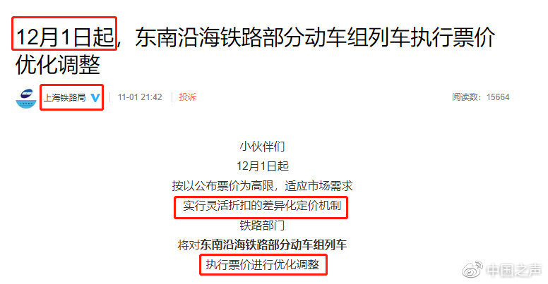據(jù)中國(guó)之聲報(bào)道: “雙十一”將至,這兩天,一條“高鐵”也要參加“雙十一”的消息引發(fā)不少人的關(guān)注。近期,上海、成都、蘭州、廣州、南寧等鐵路局集團(tuán)公司陸續(xù)發(fā)布消息,將要對(duì)票價(jià)進(jìn)行調(diào)整。當(dāng)然,說(shuō)高鐵參加“雙十一”只是個(gè)玩笑話。首先,這調(diào)價(jià)可不是從11月11號(hào)開(kāi)始;其次,雖然最高折扣達(dá)到5.5折,但總體來(lái)看,票價(jià)有升有降,可不是一味“搞促銷(xiāo)”。