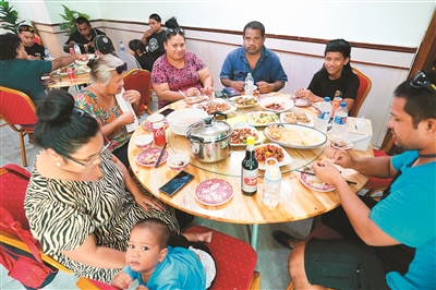 在太平洋島國(guó)瑙魯,人們?cè)谝患抑胁宛^聚餐。新華社記者 王 申攝