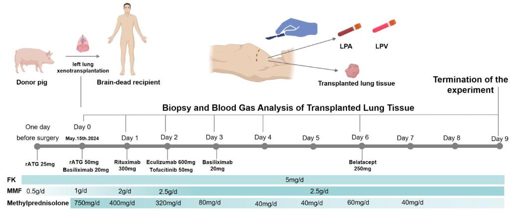 廣州醫(yī)科大學(xué)附屬第一醫(yī)院教授何建行率領(lǐng)的研究團(tuán)隊,將一只經(jīng)過基因編輯的巴馬香豬左肺移植到一名腦死亡者體內(nèi),模擬臨床常見的單肺移植手術(shù)。該供體豬經(jīng)過6處基因編輯,以降低其器官移植到人體后的免疫風(fēng)險。手術(shù)后,呼吸、血液、影像等監(jiān)測數(shù)據(jù)顯示,移植肺維持通氣與氣體交換功能長達(dá)9天,其間未發(fā)生超急性排異反應(yīng),同步病原學(xué)監(jiān)測也未發(fā)現(xiàn)活躍感染跡象。