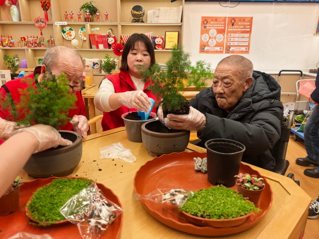 10月24日,在北京市豐臺(tái)區(qū)北宮鎮(zhèn)養(yǎng)老服務(wù)中心,志愿者正手把手教老人制作“松鶴延年”盆景。(新華社記者夏子麟 攝)