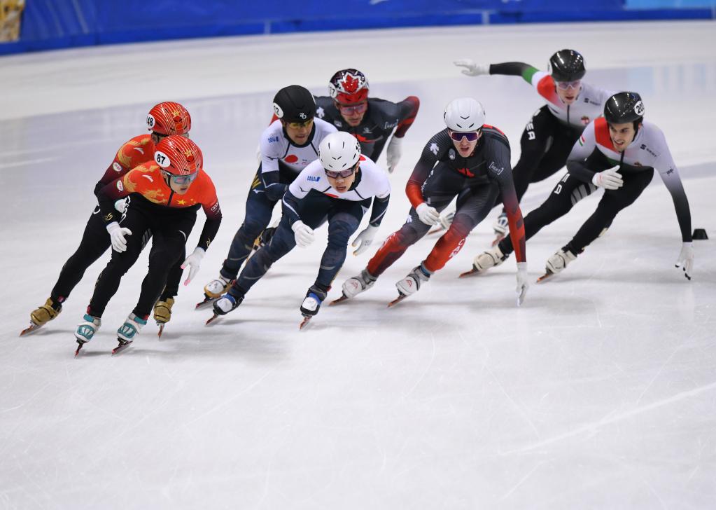 男子500米決賽中,中國選手林孝埈(左二)、鐘宇晨(左一)沖過終點。新華社記者 任鵬飛 攝