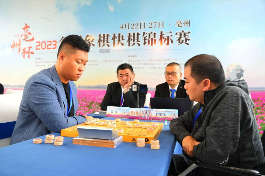 快棋組決賽采用“兩局分先制”,在亳州市華佗百草園景區(qū)進行。男子組冠軍爭奪戰(zhàn)第一局由趙攀偉執(zhí)先手,雙方以和棋收場。第二局換先再戰(zhàn),孟辰執(zhí)先手擺出“中炮直橫車進三兵”開局,趙攀偉應以“屏風馬進三卒”。雙方布局階段便產生激斗,最終孟辰通過步步精準的進攻取得勝利。