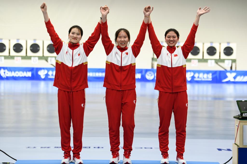 8月1日,中國隊選手熊亞瑄、林雅茜、王珂怡(從左至右)在頒獎儀式上慶祝。當日,在成都大運會射擊女子25米手槍比賽中,她們獲得團體冠軍。新華社記者曹祎銘攝