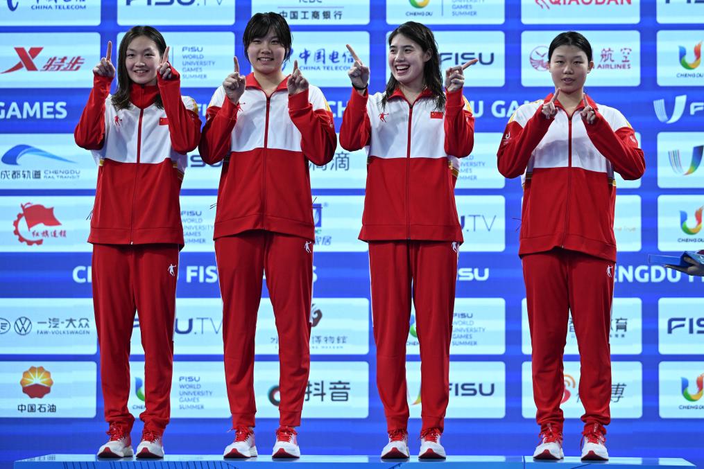 8月1日,獲得冠軍的中國隊選手李冰潔、柳雅欣、張雨霏、羅悠揚(從左至右)在女子4x100米自由泳接力頒獎儀式上。新華社記者張龍攝