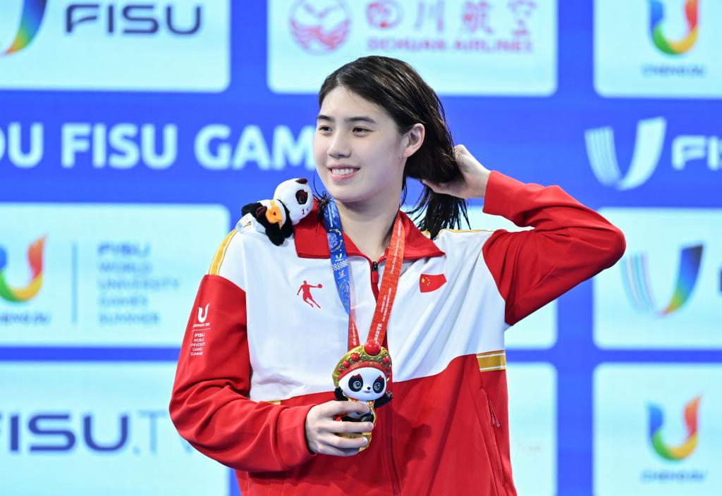 8月2日,張雨霏在女子50米蝶泳頒獎(jiǎng)儀式上。新華社記者陳澤國(guó)攝
