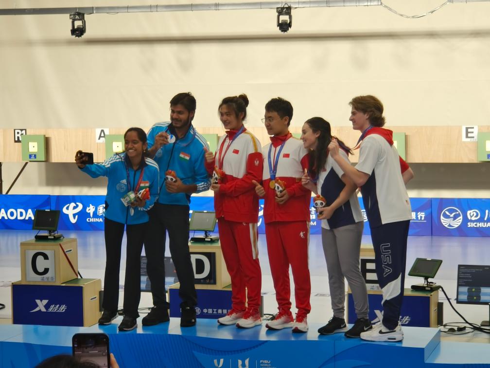 當(dāng)天,射擊賽場(chǎng)的頒獎(jiǎng)儀式現(xiàn)場(chǎng)變成了全場(chǎng)一起慶生的歡樂(lè)景象。在10米氣步槍混合團(tuán)體項(xiàng)目獲得銀牌的印度姑娘瓦拉里萬(wàn)站在領(lǐng)獎(jiǎng)臺(tái)上,在“生日快樂(lè)”的祝福聲中,伴著現(xiàn)場(chǎng)觀(guān)眾的掌聲,與一同參加頒獎(jiǎng)儀式的中國(guó)、美國(guó)選手們拍照留念。