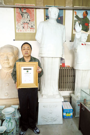 據(jù)了解,梁茂生從小熱愛收藏,在擔(dān)任“晉北民間收藏協(xié)會”會長后,用了六年時間從北京、天津、石家莊、太原等地,收購回價值200余萬元的文革時期藏品,有毛主席塑像、毛主席語錄、像章、毛主席像刺繡、報紙合訂本、全套樣板戲唱片;文革時期的景德鎮(zhèn)瓷雕、鐘表、印章;文革時期的宣傳資料、紅衛(wèi)兵上山下鄉(xiāng)的油畫等。這次獲得“大世界基尼斯之最”的毛主席瓷站像是其2萬件(套)收藏作品中的一件。