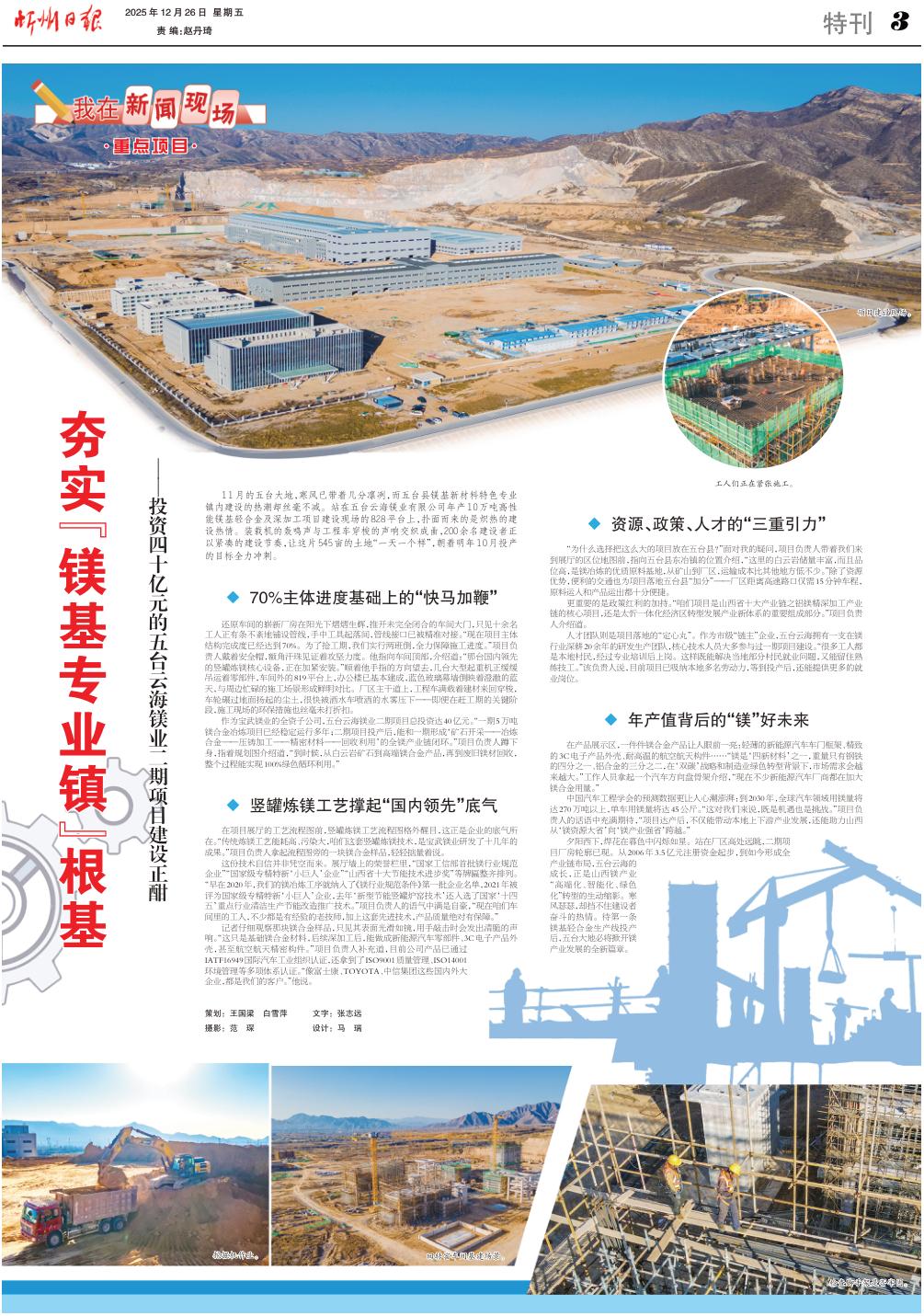 夕陽西下,焊花在暮色中閃爍如星。站在廠區(qū)高處遠(yuǎn)眺,二期項(xiàng)目廠房輪廓已現(xiàn)。從2006年3.5億元注冊資金起步,到如今形成全產(chǎn)業(yè)鏈布局,五臺云海的成長,正是山西鎂產(chǎn)業(yè)“高端化、智能化、綠色化”轉(zhuǎn)型的生動(dòng)縮影。寒風(fēng)瑟瑟,卻擋不住建設(shè)者奮斗的熱情。待第一條鎂基輕合金生產(chǎn)線投產(chǎn)后,五臺大地必將掀開鎂產(chǎn)業(yè)發(fā)展的全新篇章。