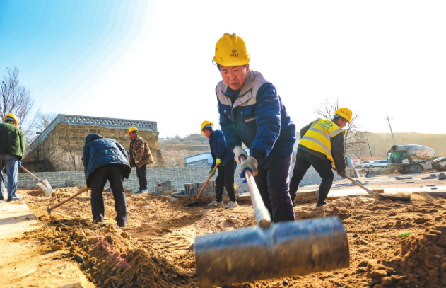 陽面村的工人正在鋪設(shè)鄉(xiāng)村驛站廣場的地面。