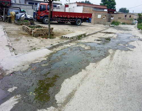 城區(qū)橋東街天宇涂料廠門口,污水橫流10 多天了,南街村有人將此修好,不到一個月,污水又開始流出了,路面變成了綠色,氣味難聞。望相關(guān)部門督查治理。(一網(wǎng)友6月21日攝)