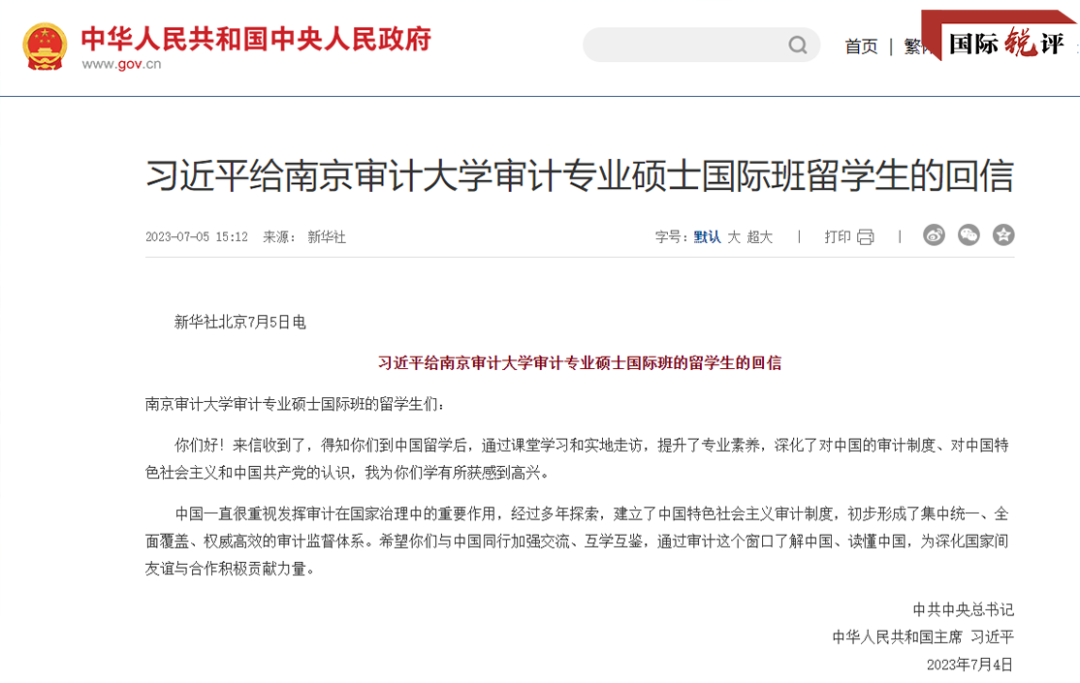 “當(dāng)?shù)弥?xí)主席給我們回信時,我非常激動、非常開心?;貒螅覍盐以谥袊鴮W(xué)到的審計知識,用到國家建設(shè)中?!?日,南京審計大學(xué)審計專業(yè)碩士國際班學(xué)生、來自馬拉維的吳娜,對中國中央廣播電視總臺的記者這樣說。