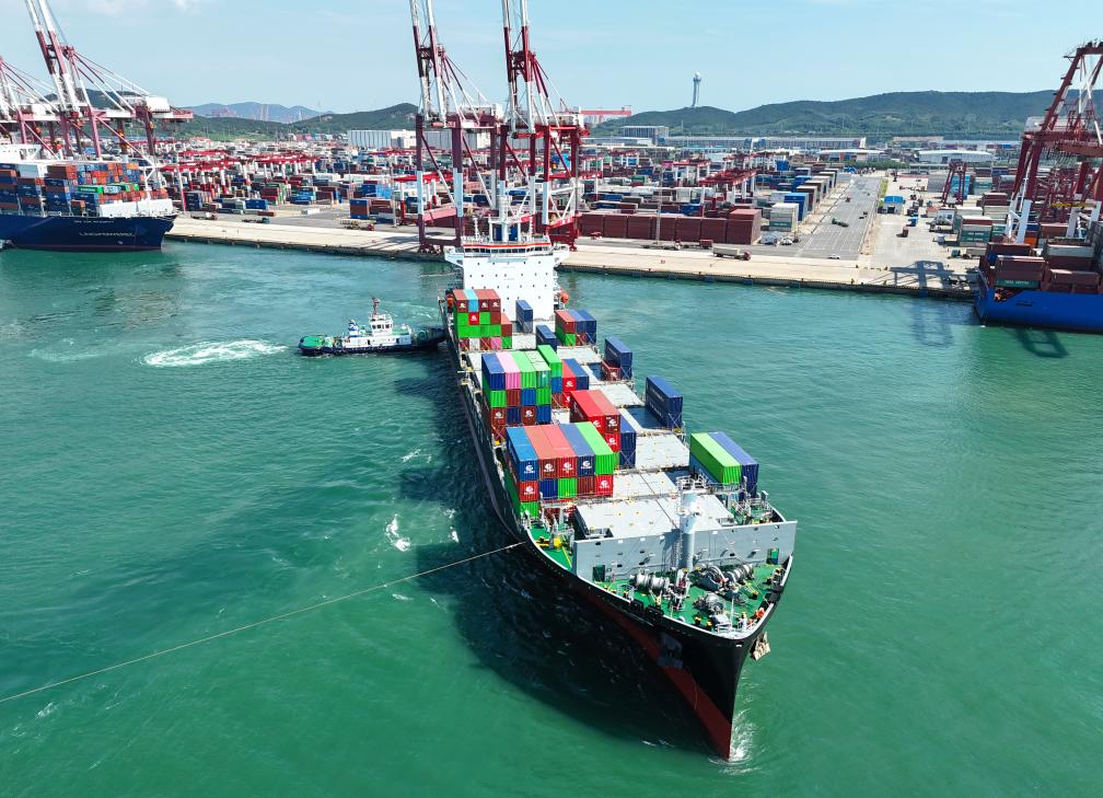 8月30日,“中外運??凇陛喚従忨傠x山東港口青島港(無人機照片)。今年以來,山東港口青島港新增10條“一帶一路”航線,“一帶一路”國家和地區(qū)箱量保持兩位數(shù)增長。新華社發(fā)(張進剛攝)