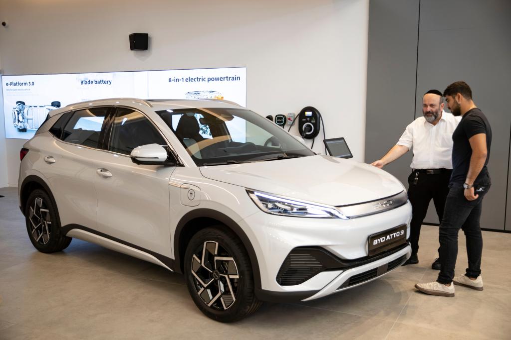 7月17日,在以色列特拉維夫一家比亞迪銷售點,顧客咨詢SUV Atto 3電動車。新華社記者陳君清攝