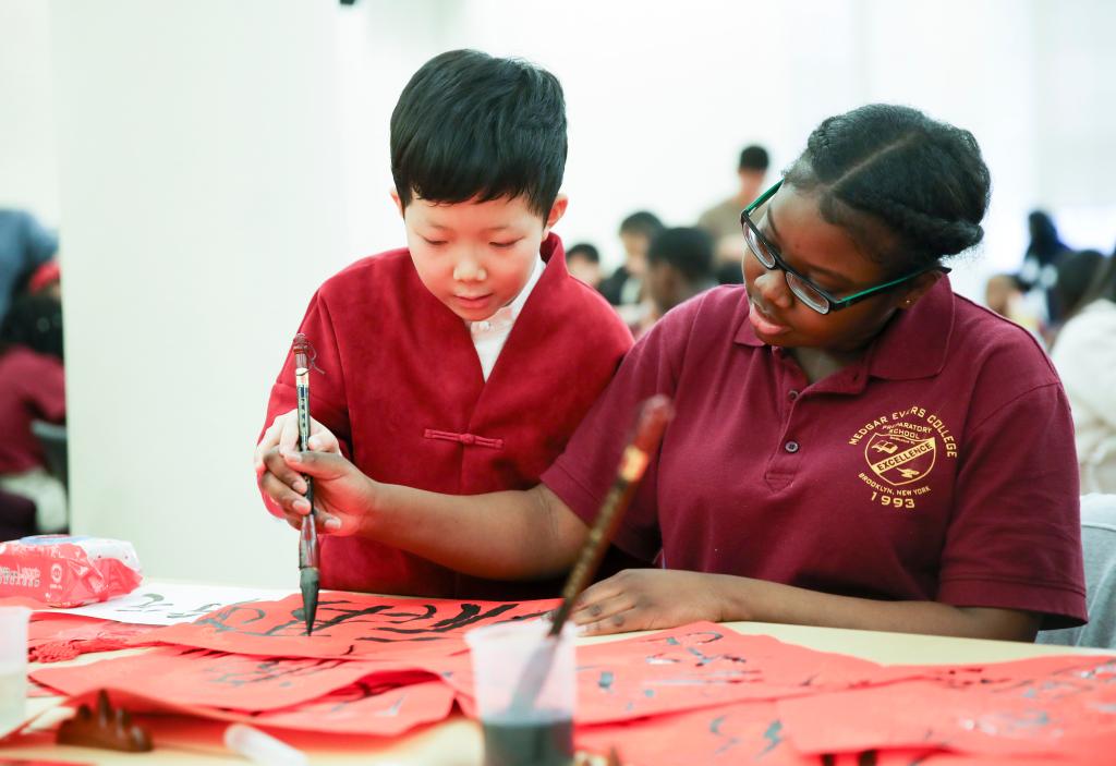 2018年2月2日,在美國紐約舉行的文化交流活動上,來自北京的小學生教紐約梅德加·埃弗斯學院預備學校的學生練習中國書法。新華社記者王迎攝