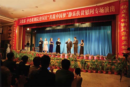 日前,文化部、中央歌劇院在靜樂(lè)縣舉辦了迎國(guó)慶“共筑中國(guó)夢(mèng)”扶貧慰問(wèn)專場(chǎng)演出。中央歌劇院的藝術(shù)家與當(dāng)?shù)馗刹咳罕娡_(tái)獻(xiàn)藝,共同重溫紅色經(jīng)典,熱情謳歌黨的光輝業(yè)績(jī)。整場(chǎng)演出薈萃眾多藝術(shù)名家,演員們激情演唱了《我們走在大路上》《我為祖國(guó)獻(xiàn)石油》《打起手鼓唱起歌》《草原上升起不落的太陽(yáng)》等膾炙人口的經(jīng)典老歌,引起了觀眾強(qiáng)烈的共鳴,現(xiàn)場(chǎng)掌聲、歡呼聲、叫好聲連綿不斷。演出不僅給當(dāng)?shù)厝罕妿?lái)一場(chǎng)精彩紛呈的文化盛宴,也激勵(lì)了干群齊心協(xié)力打好脫貧攻堅(jiān)戰(zhàn)的斗志,增強(qiáng)了百姓實(shí)現(xiàn)全面脫貧、全面小康的信心和決心。(小敏 攝)
