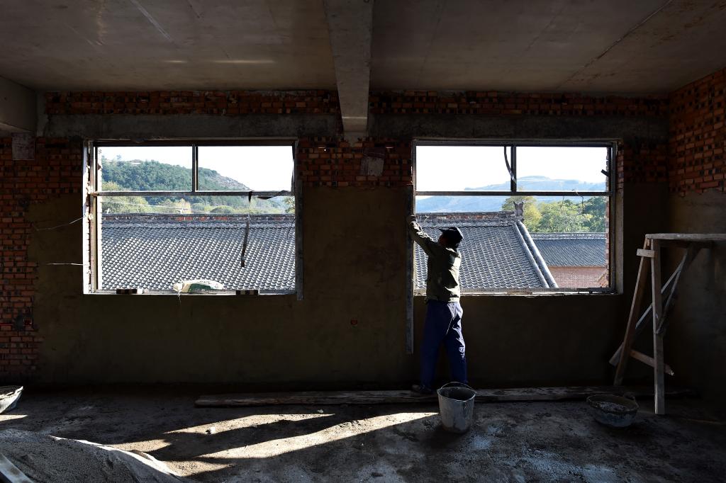 ↑在壺關(guān)縣五龍山鄉(xiāng)水池村,一位施工人員在老年日間照料中心工地上施工(10月11日攝)。