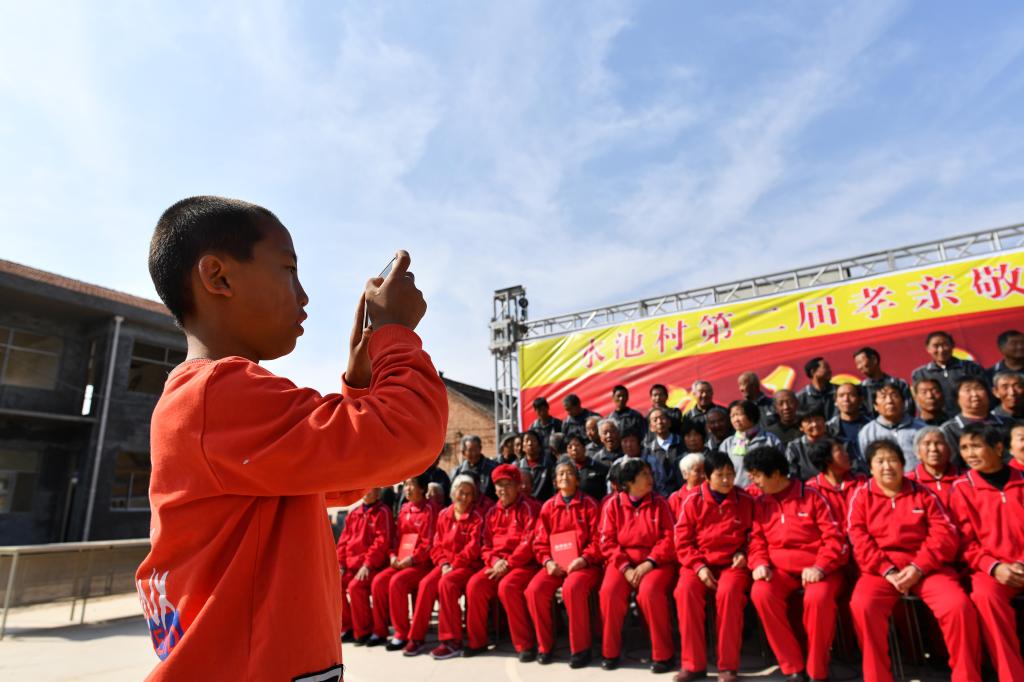 ↑一位小“攝影師”在為村里的老人們拍攝合影(10月13日攝)。