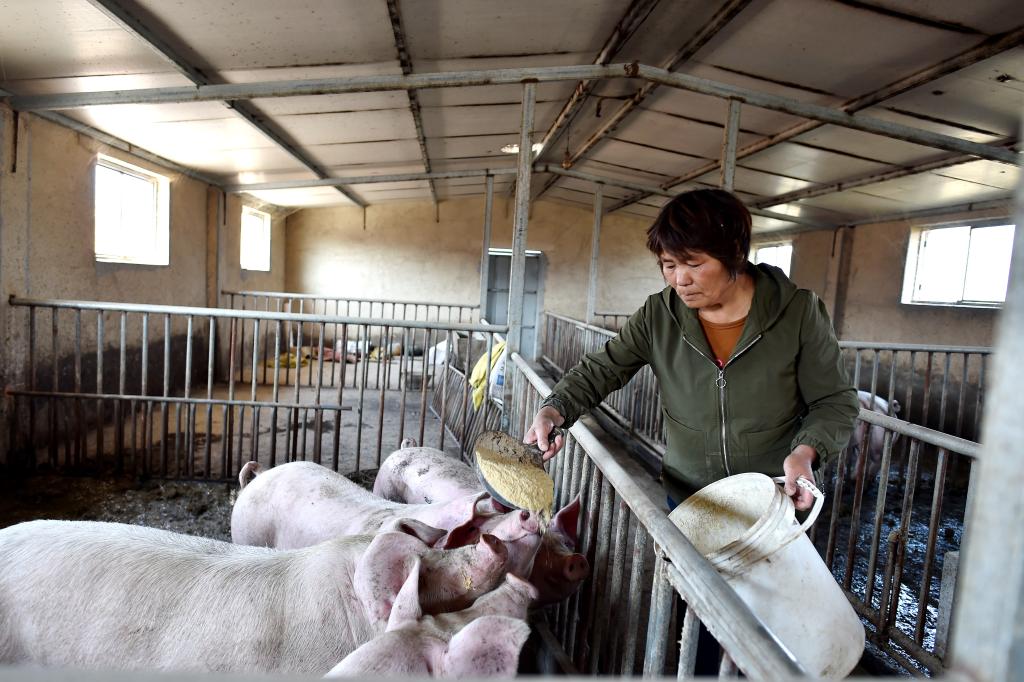 ↑在壺關(guān)縣五龍山鄉(xiāng)水池村,一位村民在豬舍里給豬添加飼料(10月12日攝)。