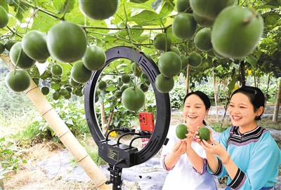 互聯(lián)網(wǎng)平臺互聯(lián)互通,將為電子商務(wù)從業(yè)者和消費者帶來更多便利。圖為日前,在貴州省黔東南苗族侗族自治州榕江縣仁里水族鄉(xiāng)通倒村羅漢果種植基地,工作人員在直播推介當(dāng)?shù)爻霎a(chǎn)的羅漢果。李長華攝(人民視覺)