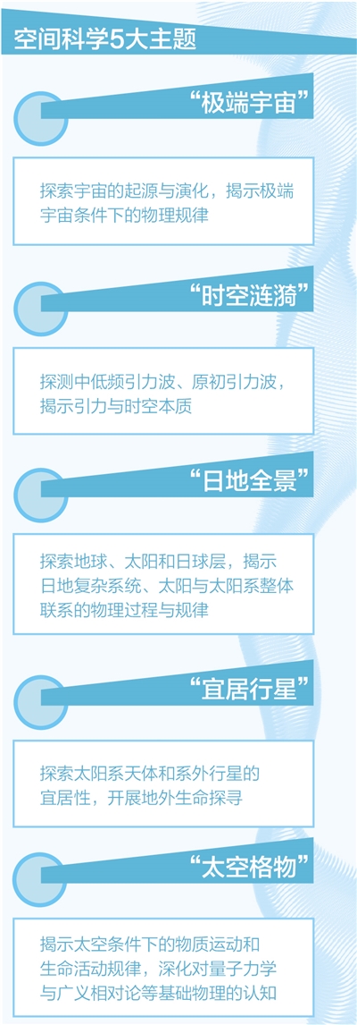 “太空格物”主題。主要是揭示太空條件下的物質(zhì)運動和生命活動規(guī)律,深化對量子力學與廣義相對論等基礎(chǔ)物理的認知。優(yōu)先發(fā)展方向包括微重力科學、量子力學與廣義相對論、空間生命科學等。