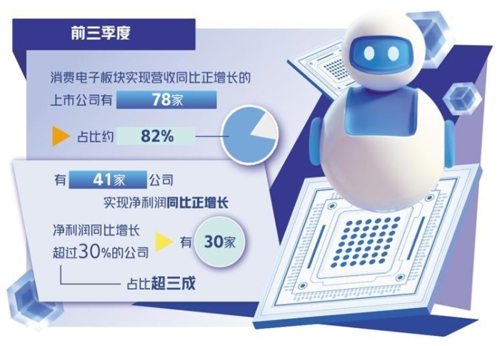 今年以來,消費(fèi)電子板塊復(fù)蘇明顯。數(shù)據(jù)顯示,前三季度,消費(fèi)電子板塊實(shí)現(xiàn)營收同比正增長(zhǎng)的上市公司有78家,占比約82%;有41家公司實(shí)現(xiàn)凈利潤同比正增長(zhǎng),凈利潤同比增長(zhǎng)超過30%的公司有30家,占比超三成。尤其是第三季度,行業(yè)延續(xù)復(fù)蘇趨勢(shì),一批公司實(shí)現(xiàn)營收、凈利潤的雙增長(zhǎng)。
