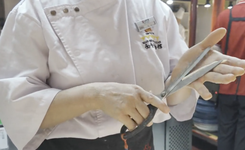 圖為夾心面。新華社記者 王怡靜 攝??關(guān)于剪刀面的故事很動(dòng)人——“‘剪子面,兩頭尖,吃到肚里胃不酸’。相傳剪刀面是以前喬家大院的喬貴發(fā)走西口的時(shí)候,留在家里的妻子為丈夫裁剪衣服,由于過于思念丈夫,一走神就把剪刀也帶到了廚房里,于是便有了剪子面?!覆凰帷?,其實(shí)也是‘心不酸’?!崩铉f。剪刀面一般用來做湯面,配蔬菜吃,也有著希望家人安康的寄托。
