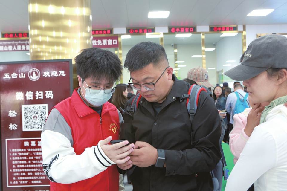 五臺山游客服務中心大廳內,志愿者正在協(xié)助游客網(wǎng)上購票。李春澤攝