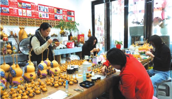 在工作室內(nèi),手工藝人侯晉麗正專注地為葫蘆彩繪。她介紹說:“我們制作的每一件葫蘆雕刻作品都需要多重工序,從篩選葫蘆到刮皮、晾曬、浸泡、拋光,再到依形構(gòu)思、打稿設(shè)計,最后經(jīng)過線刻、浮雕等精雕細琢與上色收尾,每一個工序都考驗著我們的耐心與功力?!?/p>