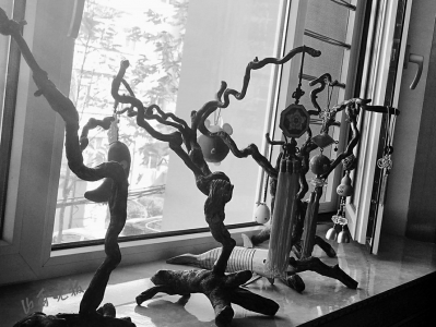 見到牛鳴遠時,他正忙著在家中的陽臺上懸掛兩個大樹枝?!斑@是棗樹枝,還有點濕,得掛起來晾干后才能再進行加工?!迸xQ遠說,朋友收拾平遙老家的房子時,砍了院子里的大棗樹,知道他喜歡根雕,就專門運回來一些送給他。