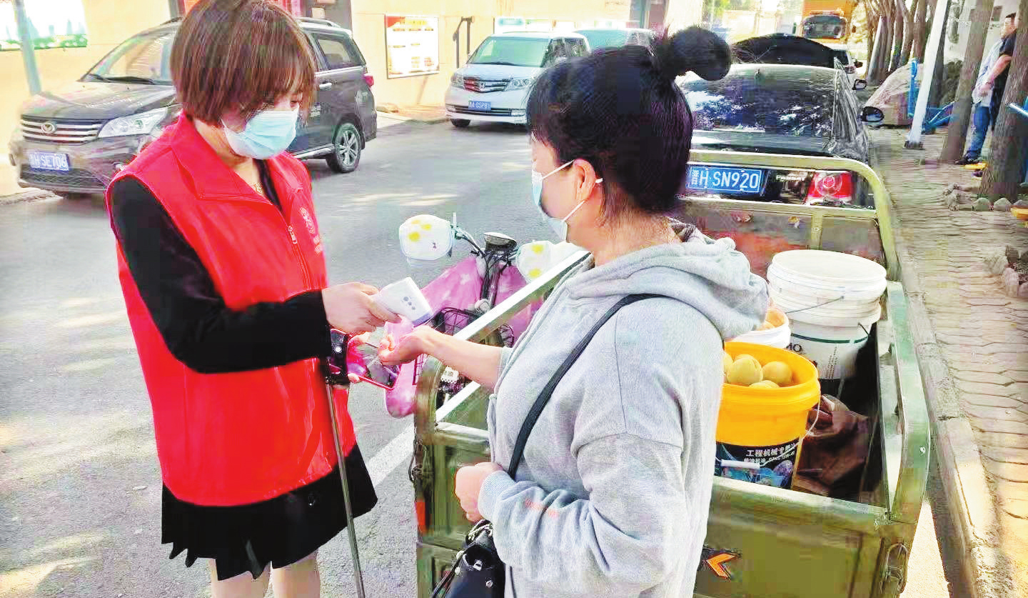 忻府區(qū)南街村新時(shí)代文明實(shí)踐站的志愿者在橋西街巷為居民測體溫。 許寧寧 攝