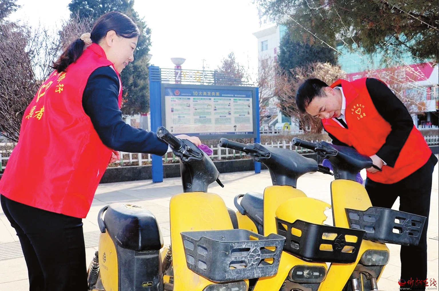 三月春風(fēng)拂揚(yáng)柳,雷鋒精神閃光芒。為進(jìn)一步弘揚(yáng)雷鋒精神,推動(dòng)學(xué)雷鋒活動(dòng)常態(tài)化,鞏固提升創(chuàng)衛(wèi)成果,營(yíng)造和諧優(yōu)美環(huán)境,連日來(lái),五寨農(nóng)商銀行機(jī)關(guān)黨員志愿服務(wù)隊(duì)組織開(kāi)展了“擦亮共享單車(chē),助力文明出行”志愿服務(wù)活動(dòng)。(張家源攝)