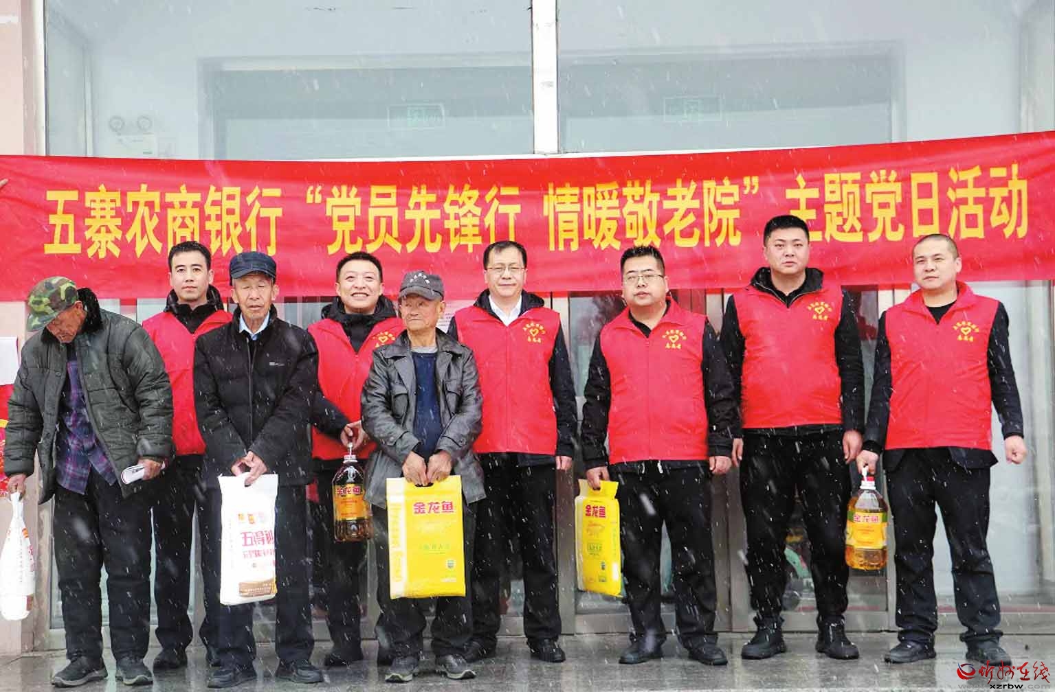 近日,五寨農(nóng)商銀行組織部分機(jī)關(guān)黨員干部和志愿者前往五寨縣北苑敬老院,開展“黨員先鋒行 情暖敬老院”主題黨日活動暨“弘揚(yáng)雷鋒精神 敬老院里顯真情”志愿服務(wù)活動,用實(shí)際行動踐行雷鋒精神,為老人們送去溫暖和關(guān)懷。(張家源攝)