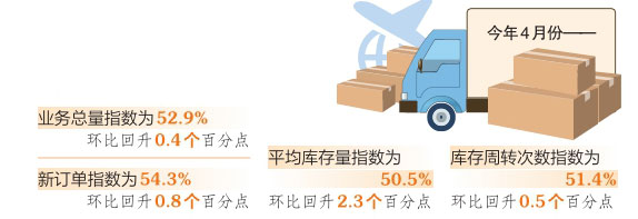 業(yè)務(wù)總量指數(shù)與新訂單指數(shù)雙回升。4月份,業(yè)務(wù)總量指數(shù)為52.9%,環(huán)比回升0.4個(gè)百分點(diǎn);新訂單指數(shù)為54.3%,環(huán)比回升0.8個(gè)百分點(diǎn)。顯示出物流行業(yè)規(guī)模在擴(kuò)張區(qū)間,業(yè)務(wù)總量指數(shù)、新訂單指數(shù)均保持增長(zhǎng)態(tài)勢(shì),經(jīng)濟(jì)延續(xù)回升態(tài)勢(shì)不變,物流市場(chǎng)需求繼續(xù)釋放。