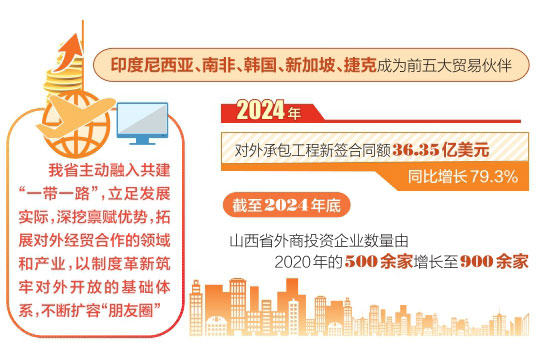 對外投資和工程承包業(yè)務(wù)同樣是我省共建“一帶一路”的一大亮點。2024年不斷完善海外綜合服務(wù)體系,非金融類直接投資達(dá)6517萬美元,同比大增408.7%。這表明山西省企業(yè)加快了“走出去”的步伐,積極在海外布局,拓展國際投資領(lǐng)域,尋求更廣闊的發(fā)展空間和資源。同時,對外承包工程新簽合同額36.35億美元,同比增長79.3%。截至2024年底,山西省外商投資企業(yè)數(shù)量由2020年的500余家增長至900余家。