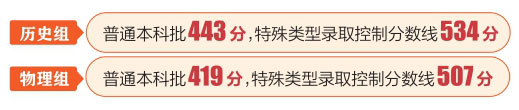 2025年我省普通高校招生本科各類錄取最低控制分?jǐn)?shù)線和特殊類型錄取控制分?jǐn)?shù)線,歷史組:普通本科批443分,特殊類型錄取控制分?jǐn)?shù)線534分;物理組:普通本科批419分,特殊類型錄取控制分?jǐn)?shù)線507分。