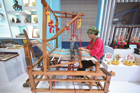 8月21日,運(yùn)城展區(qū),工作人員展示老粗布制作過程。本報(bào)記者阮洋攝