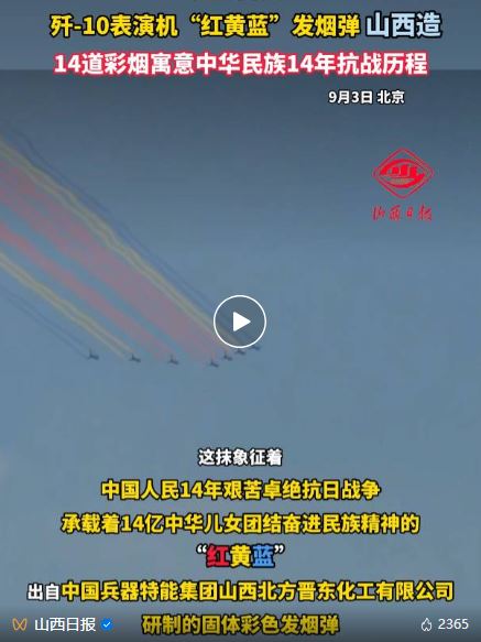 閱兵式上,10時(shí)25分左右,殲-10表演機(jī)從天空呼嘯而過(guò),留下14條絢麗奪目的彩煙——這抹象征著中國(guó)人民14年艱苦卓絕抗日戰(zhàn)爭(zhēng)、承載著14億中華兒女團(tuán)結(jié)奮進(jìn)民族精神的“紅黃藍(lán)”,出自中國(guó)兵器特能集團(tuán)山西北方晉東化工有限公司(以下簡(jiǎn)稱“晉東公司”)研制的固體彩色發(fā)煙彈。