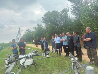8月18日下午,在朔城區(qū)高升農(nóng)機專業(yè)合作社的試驗田里,一場別開生面的“病蟲害綠色防控田間課堂”正在進行——沒有黑板粉筆,取而代之的是嗡嗡作響的無人機、閃著藍光的太陽能殺蟲燈,還有掛在玉米稈上不起眼的小卡片……來自全區(qū)各鄉(xiāng)鎮(zhèn)的種糧大戶代表、農(nóng)機合作社負責(zé)人、農(nóng)技人員共計50余人一起觀摩學(xué)習(xí)。