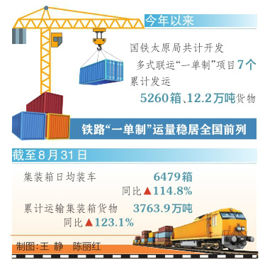 在持續(xù)拓展集裝箱運輸品類的同時,國鐵太原局還積極優(yōu)化實施多式聯(lián)運“一單制”運輸模式。今年以來,先后聯(lián)合17家企業(yè)開發(fā)了生鐵、鉻鐵、化肥、焦炭等鐵水聯(lián)運全程物流產品,實現(xiàn)山西至全國各主要港口航線“一單到底”。今年以來,國鐵太原局共計開發(fā)多式聯(lián)運“一單制”項目7個,累計發(fā)運5260箱、12.2萬噸貨物,鐵路“一單制”運量穩(wěn)居全國前列。
