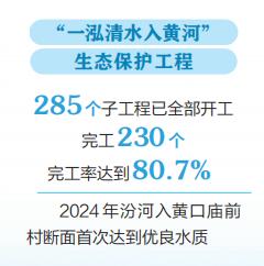 碧水保衛(wèi)戰(zhàn)鞏固提升。深入開(kāi)展黃河干流流經(jīng)縣生態(tài)環(huán)境綜合治理攻堅(jiān)行動(dòng),全面完成黃河流域入河排污口排查整治,全省3915個(gè)入河排污口納入平臺(tái)監(jiān)管。嚴(yán)格落實(shí)“四水四定”,建立全省管控指標(biāo)體系,強(qiáng)化水資源消耗總量和強(qiáng)度剛性約束,實(shí)施深度節(jié)水控水行動(dòng),萬(wàn)元工業(yè)增加值用水量較“十三五”末下降30.0%。開(kāi)展地下水超采綜合治理,全省地下水位整體回升2.51米,持續(xù)推進(jìn)全省19處巖溶大泉保護(hù)治理,斷流30年的晉祠泉2023年實(shí)現(xiàn)復(fù)流。全省地表水國(guó)考斷面優(yōu)良水體比例由“十三五”末的70.7%提升至2024年的94.7%,連續(xù)兩年超過(guò)國(guó)家平均水平,黃河干流(山西段)水質(zhì)連續(xù)三年穩(wěn)定達(dá)到Ⅱ類,汾河入黃口斷面2024年首次達(dá)Ⅲ類優(yōu)良。