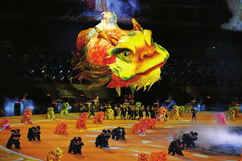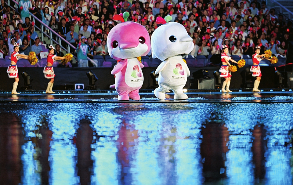 第十五屆全國(guó)運(yùn)動(dòng)會(huì)吉祥物“喜洋洋”和“樂(lè)融融”在開(kāi)幕式現(xiàn)場(chǎng)表演。圖片均為開(kāi)幕式表演現(xiàn)場(chǎng)。 本版圖片均來(lái)源新華社