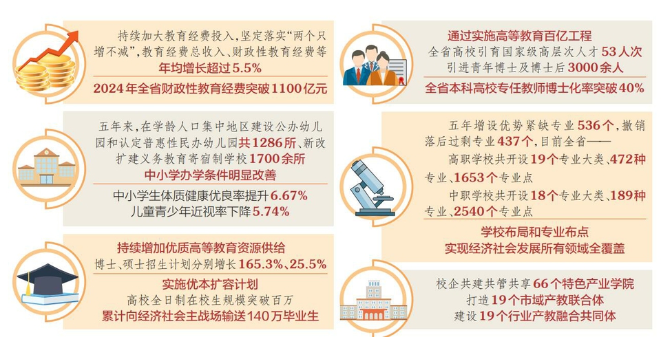 省委教育工委書記,省教育廳黨組書記、廳長馬駿介紹,“十四五”期間,我省持續(xù)加大教育經(jīng)費(fèi)投入,堅(jiān)定落實(shí)“兩個(gè)只增不減”,教育經(jīng)費(fèi)總收入、財(cái)政性教育經(jīng)費(fèi)等年均增長超過5.5%,2024年全省財(cái)政性教育經(jīng)費(fèi)突破1100億元。推進(jìn)基礎(chǔ)教育擴(kuò)優(yōu)提質(zhì),組建600個(gè)城鄉(xiāng)教育共同體,有序增加高中學(xué)位供給,20萬人口以上的縣實(shí)現(xiàn)特殊教育學(xué)校全覆蓋,隨遷子女、殘疾兒童平等接受教育得到充分保障。學(xué)生資助體系實(shí)現(xiàn)學(xué)段、學(xué)校、學(xué)生全覆蓋,累計(jì)惠及1373萬人次。今年起免除公辦幼兒園學(xué)前一年保教費(fèi),群眾的教育獲得感、幸福感持續(xù)提升。