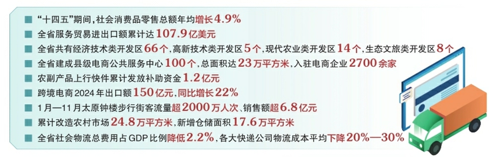 “‘十四五’期間,省商務(wù)廳充分發(fā)揮區(qū)位、資源與產(chǎn)業(yè)優(yōu)勢,出臺對外開放‘1+N’政策體系,發(fā)展外貿(mào)新業(yè)態(tài)新模式,穩(wěn)住了外貿(mào)基本盤。”省商務(wù)廳副廳長李國榮介紹說,包括外向型經(jīng)濟(jì)指標(biāo)穩(wěn)中有進(jìn),全省實際使用外資累計36.8億美元,全省非金融類對外直接投資額累計12.5億美元;開放平臺能級不斷提升,支持武宿綜保區(qū)加快“五大中心”建設(shè),支持山西方略、大同國際陸港、山西蘭花3個保稅物流中心拓展保稅物流、倉儲等功能;開放通道建設(shè)穩(wěn)步推進(jìn),大同、運(yùn)城航空口岸與太原航空口岸共同構(gòu)成“南北一線”的口岸布局。中歐班列提質(zhì)增效,累計開行1048列。出臺鐵海聯(lián)運(yùn)支持政策,形成中鼎物流園—天津港、中鼎物流園—青島港兩條圖定班列。太原國際郵件互換局?jǐn)U容升級項目投入運(yùn)營;開放環(huán)境持續(xù)優(yōu)化,全面推廣山西國際貿(mào)易“單一窗口”平臺應(yīng)用,太原航空口岸列入國家240小時過境免簽政策適用口岸范圍,加大進(jìn)出口信貸等金融支持力度,推動貿(mào)易外匯收支便利化政策擴(kuò)面提質(zhì)。