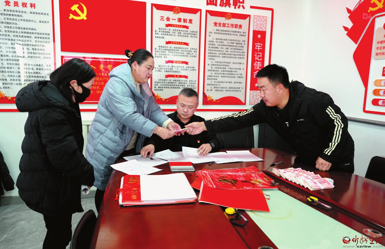農(nóng)歷新年即將來臨,五寨縣孫家坪鄉(xiāng)大輻車梁村村委會辦公室里人頭攢動,好不熱鬧。大輻車梁村雙福農(nóng)貿(mào)農(nóng)民專業(yè)合作社年終分紅儀式正在這里舉行?!斑@是我們合作社成立5年來的第4次分紅,合作社成立5年來共盈利35萬元,全部分紅給脫貧戶。今年又是一個豐收年?!狈旨t大會上,村黨支部書記沈鵬細(xì)數(shù)村里一年的發(fā)展“成績單”,大輻車梁村通過農(nóng)副產(chǎn)品加工銷售,帶動村集體經(jīng)濟(jì)增收。簽名字、摁手印、數(shù)鈔票……村民們排隊領(lǐng)錢,臉上堆滿笑容。領(lǐng)到分紅金的村民沈汾開心地說:“家里兩口人,領(lǐng)了1000塊錢,能買不少年貨,感謝黨的好政策?!?/p>