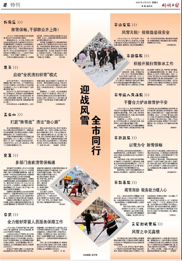 稅務干部們共同努力,為廣大居民和納稅人創(chuàng)造了一個安全、便捷的出行環(huán)境。此次鏟雪行動不僅展現(xiàn)了忻州稅務人團結協(xié)作、勇于擔當?shù)木耧L貌,更彰顯了忻州稅務全力踐行新時代“楓橋經驗”的實際行動,傳遞了忻州稅務服務人民、奉獻社會的正能量。 (羅治東)