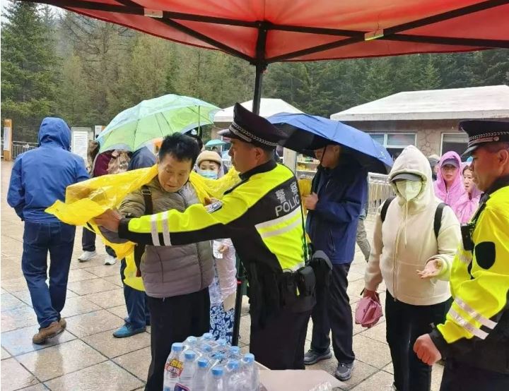 寧武縣公安局景區(qū)安保指揮部通過視頻巡查發(fā)現(xiàn)這一情況后,迅速下達(dá)指令:“各巡防隊(duì),迅速巡查景區(qū)內(nèi)雨中游客,將游客轉(zhuǎn)移到便民服務(wù)站和中轉(zhuǎn)點(diǎn)避雨,確保游客絕對安全”“各執(zhí)勤點(diǎn),迅速將便民服務(wù)站的雨傘、雨衣送到游客手中”。