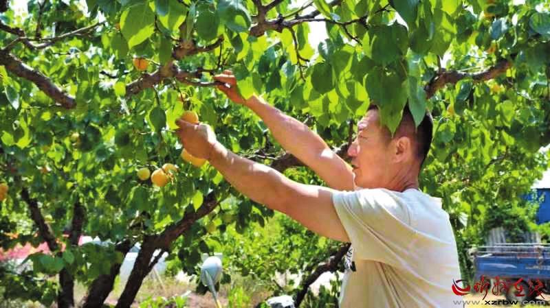 村民張連成每天早早地就來到自家杏園里摘杏,然后進(jìn)行挑選、裝箱,忙得不亦樂乎?!懊刻於寄芙拥讲簧儆唵危瑸榱吮WC杏的新鮮度,必須當(dāng)天現(xiàn)摘才行?!睆堖B成一邊跟記者交談,一邊熟練地將白水杏挨個包好果網(wǎng)裝箱?!拔曳N了30畝的白水杏,一畝地差不多能產(chǎn)1000多斤,按照歷年的行情來說,差不多能掙七八萬?!闭f到收入,老張笑得合不攏嘴。